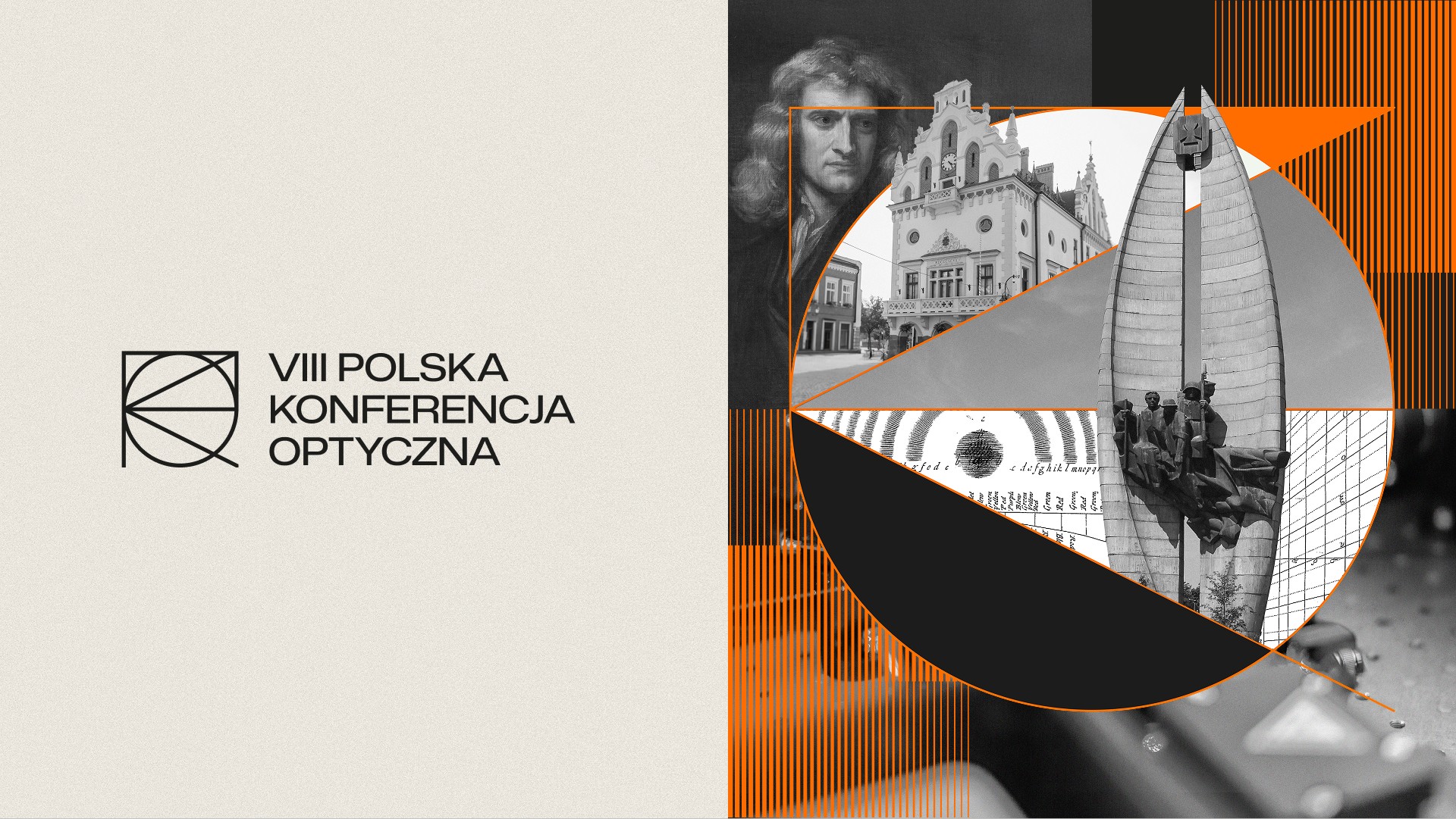 Centralnym elementem identyfikacji jest plakat. W jego centrum znajduje się kolaż łączący motywy fizyczno-optyczne z elementami miejskimi — w tej edycji bezpośrednio związanymi z Rzeszowem. To kontynuacja rozwiązania znanego z poprzednich lat, cenionego przez środowisko i mocno związanego z tradycją konferencji. Nowa interpretacja zachowuje ten sentyment, jednocześnie wprowadzając bardziej nowoczesną estetykę i uporządkowany układ.