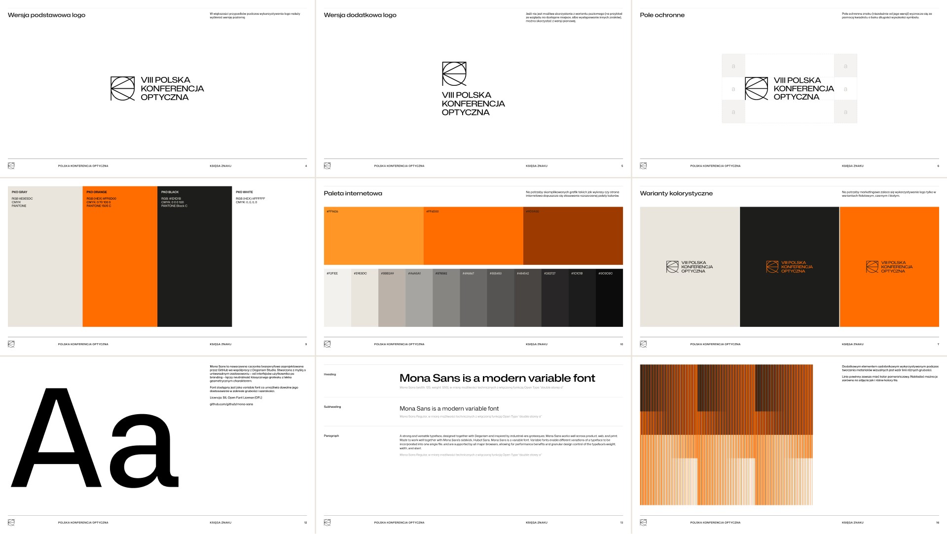 Typografia oparta na Mona Sans zapewnia wysoką czytelność we wszystkich formatach. Jeden krój i spójny sposób stosowania ułatwiają pracę zespołowi po stronie organizatora.